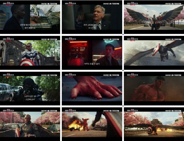특히 연설회장에서 갑자기 쓰러진 로스 대통령의 모습과 이후 “빨간색도 있었나?” 라는 대사와 함께 모든 것이 부서진 폐허 속에서 등장한 ‘레드헐크’의 모습은 보는 이들을 압도한다. 이어 모두가 기다렸던 캡틴 아메리카와 레드헐크의 격돌은 강렬한 전율을 불러일으킨다. 거침 없는 힘과 분노를 표출하는 레드헐크와 “감당할 수 있겠어? 어디 덤벼봐!”라며 날개와 비브라늄 방패를 이용해 압도적인 힘에 팽팽히 맞서는 캡틴 아메리카의 대치는 날카로운 긴장감을 전하며 이후 펼쳐질 숨막히는 대결을 기대하게 한다. 또한 예고편 전반에 걸쳐 새로운 캡틴 아메리카의 트레이드마크인 날개를 활용, 거침없이 하늘을 질주하며 전투기들 사이에서 활보하는 활강 액션을 비롯해 비브라늄 방패를 필두로 펼쳐지는 타격감 넘치는 액션과 숨가쁜 총격전까지 ‘캡틴 아메리카’ 시리즈만의 속도감 넘치고 놀라운 스케일을 자랑하는 강렬한 액션은 관객에게 짜릿한 쾌감을 선사할 예정이다.