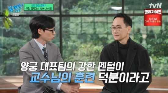 이날 유재석은 "얼마 전에 양궁 국가대표 김우진 선수가 '유퀴즈'에서 교수님 이야기를 했다. 우리 양궁 선수들의 높은 멘탈이 교수님이 영향을 주셨다고 볼 수도 있겠다"라며