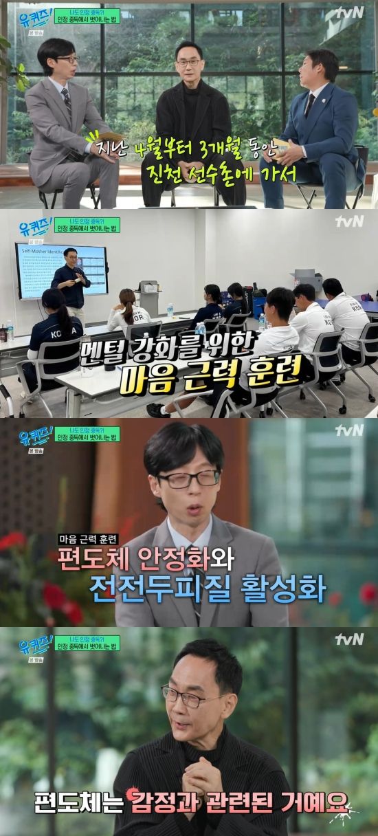 김주환 교수는 "지난 4월부터 한 석 달 동안 선수촌 가서 훈련을 집중적으로 시켜드렸다. 제가 하는 마음 근력 훈련이라는 건 뇌과학적 입장에서 볼 때 편도체 안정화와 전전두피질 활성화다. 감정과 관련된 거다. 우리가 불안하거나 긴장하거나 기분 나쁘거나 화나거나 짜증 나면 편도체가 활성화된다. 공격이나 도망가려는 상태. 부정적 감정이 있다"라며 밝혔다.