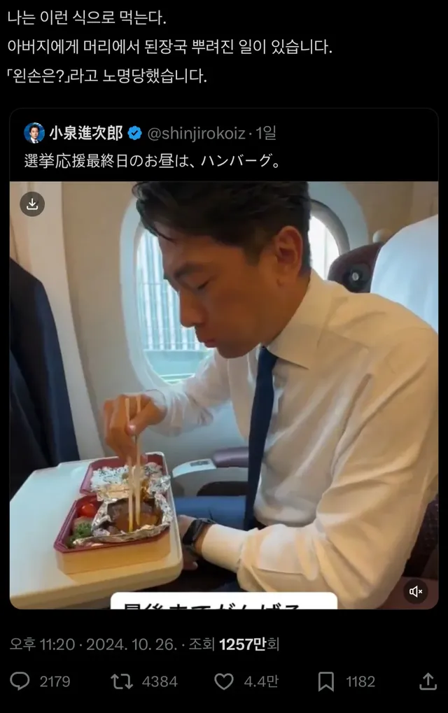 일본 유명한 정치인 펀쿨섹좌가 트위터에 밥먹는모습을 올림