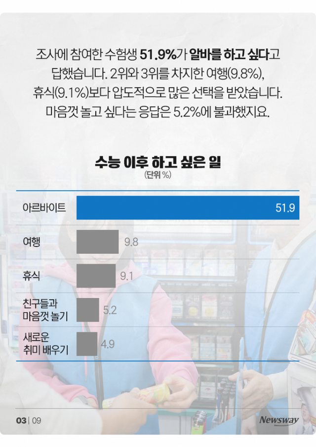 조사에 참여한 수험생 51.9%가 알바를 하고 싶다고 답했습니다. 2위와 3위를 차지한 여행(9.8%), 휴식(9.1%)보다 압도적으로 많은 선택을 받았습니다. 마음껏 놀고 싶다는 응답은 5.2%에 불과했지요.