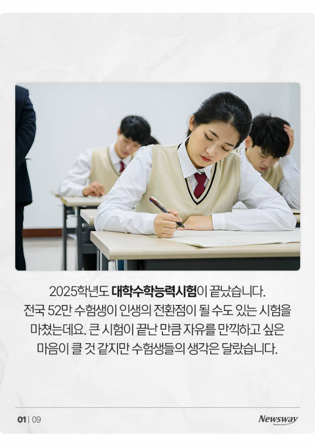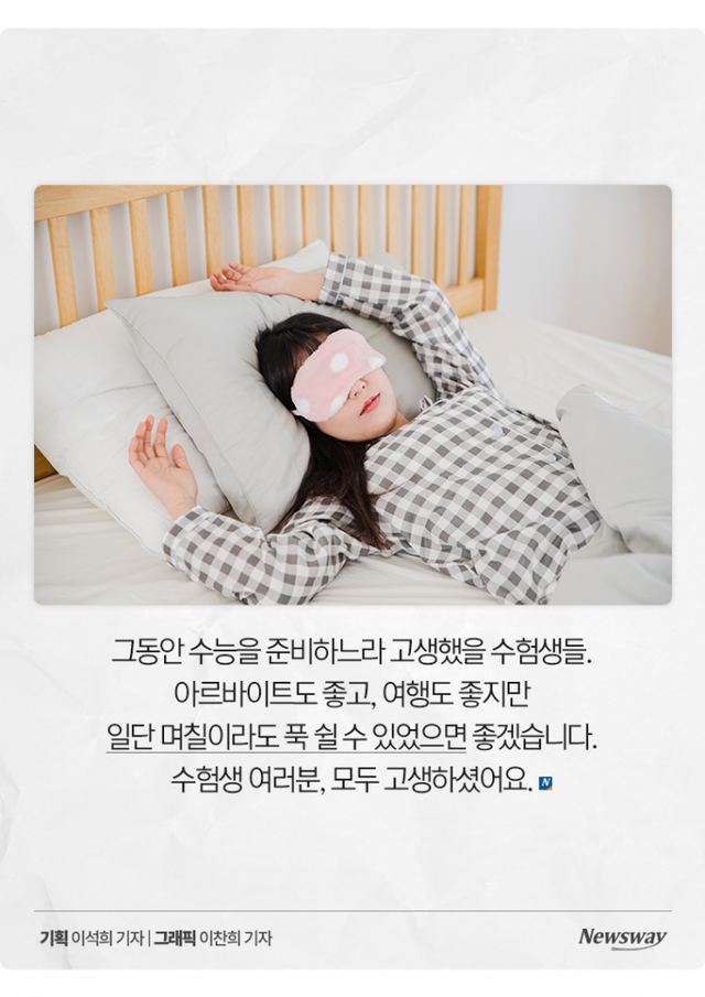 그동안 수능을 준비하느라 고생했을 수험생들. 아르바이트도 좋고, 여행도 좋지만 일단 며칠이라도 푹 쉴 수 있었으면 좋겠습니다. 수험생 여러분, 모두 고생하셨어요.