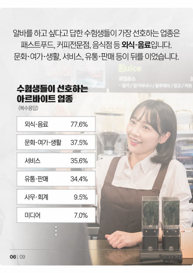 알바를 하고 싶다고 답한 수험생들이 가장 선호하는 업종은 패스트푸드, 커피전문점, 음식점 등 외식·음료입니다. 문화·여가·생활, 서비스, 유통·판매 등이 뒤를 이었습니다.