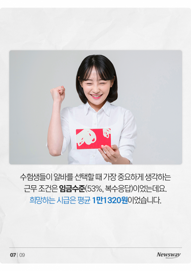 수험생들이 알바를 선택할 때 가장 중요하게 생각하는 근무 조건은 임금수준(53%, 복수응답)이었는데요. 희망하는 시급은 평균 1만1320원이었습니다.