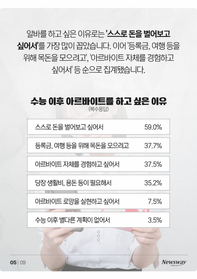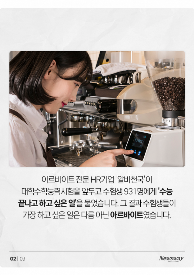 아르바이트 전문 HR기업 '알바천국'이 대학수학능력시험을 앞두고 수험생 931명에게 '수능 끝나고 하고 싶은 일'을 물었습니다. 그 결과 수험생들이 가장 하고 싶은 일은 다름 아닌 아르바이트였습니다.
