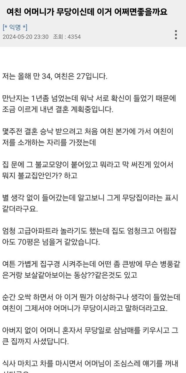 혼자 3남매 키우면서 70평대 아파트까지 사셨을정도믄 엄청 용하다 유명한 무당일것같은디