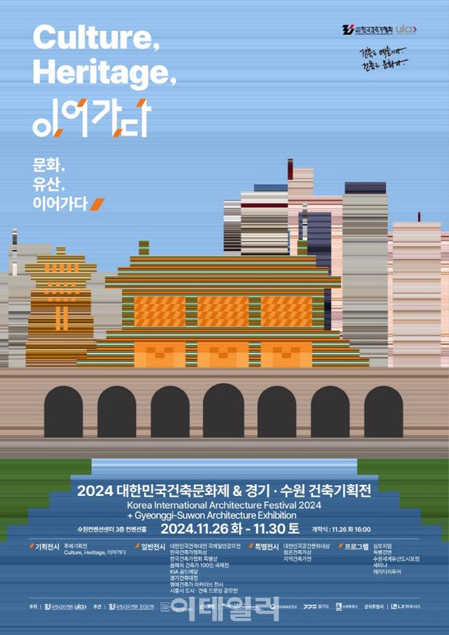 한국건축가협회가 주최하고 한국건축가협회 경기지회와 수원컨벤션센터가 공동 주관하는 이 행사는 ‘문화, 유산, 이어가다-Cultural Heritage, Today & Tomorrow’란 주제로 과거와 현재가 연결된 문화적 흐름 속에서 건축자산의 살아있는 가치를 경험할 수 있도록 기획한 주제기획전과 우리의 국가유산과 새로운 방식으로 소통할 수 있는 기회를 제공하는 행사들이 개최된다.