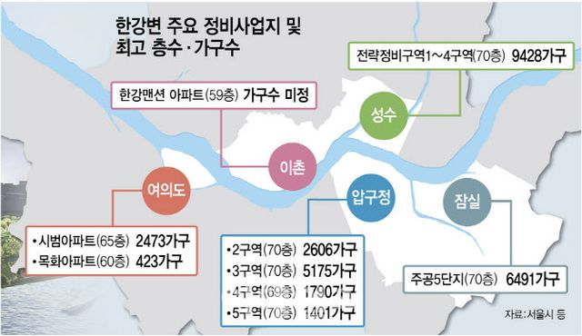 이미 한강변을 따라 서울 곳곳 초고층 아파트 단지를 짓는 정비사업들이 속도를 내고 있기도 하다. 잠실대교 남단 송파구 잠실동 27번지 일대 잠실주공5단지는 지상 최고 70층 이내로 재건축을 추진 중이다. 당초 지상 최고 68층 높이로 재건축을 추진하던 용산구 이촌동 한강맨션 아파트는 최근 59층으로 키를 낮추면서도 초고층 스카이라인을 포기하지 않았다.