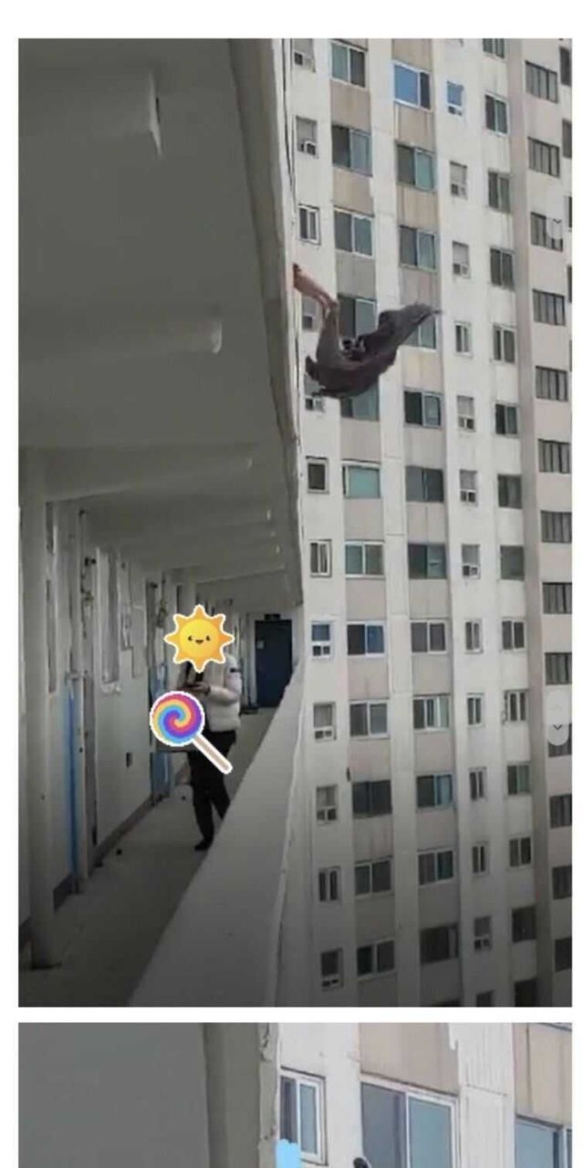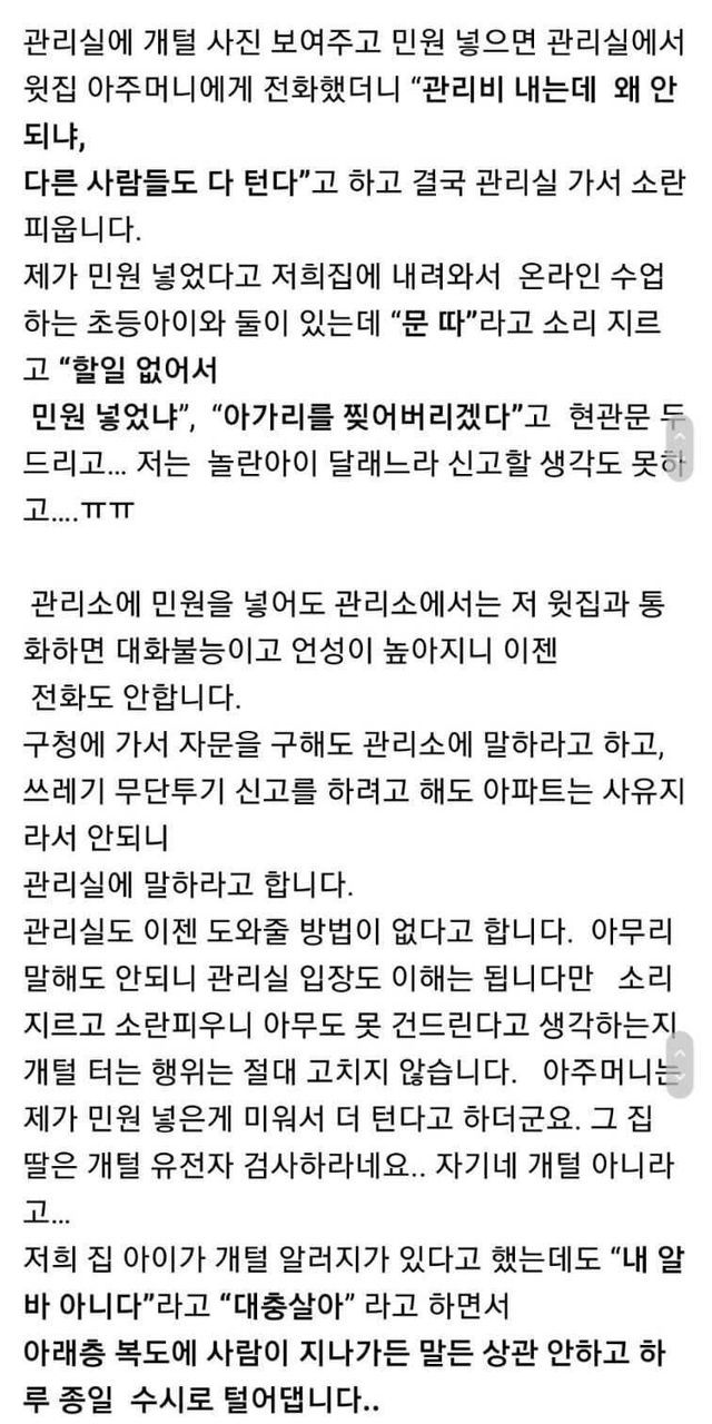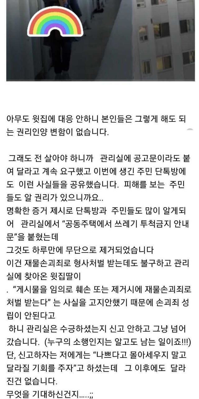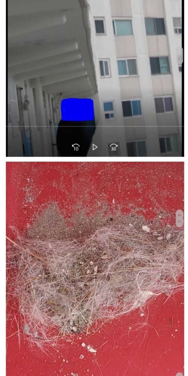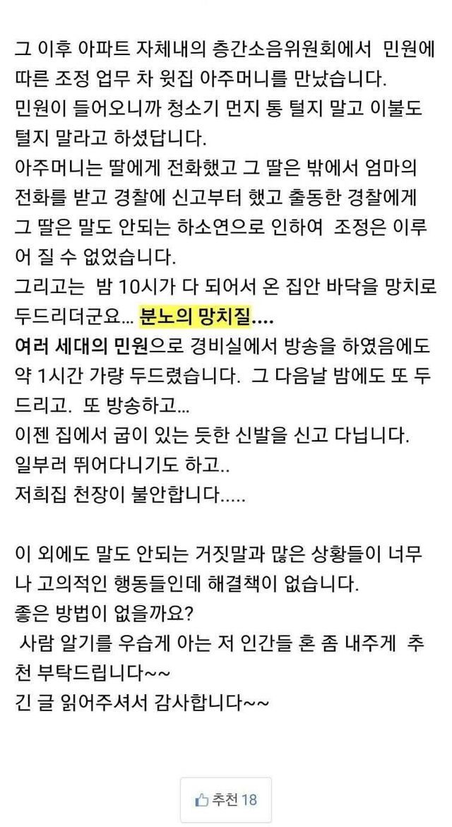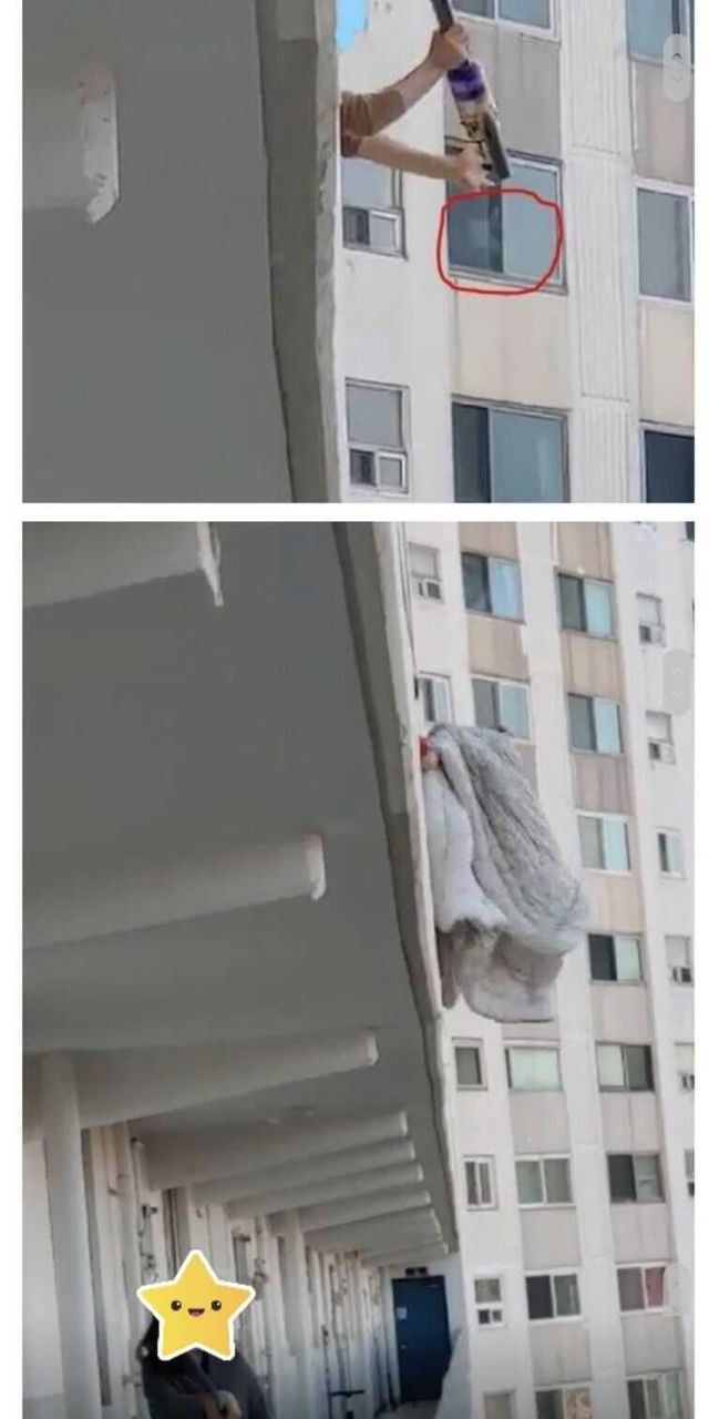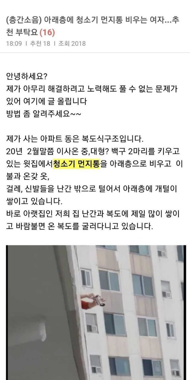 아래층에 먼지통 비우는 여자.
