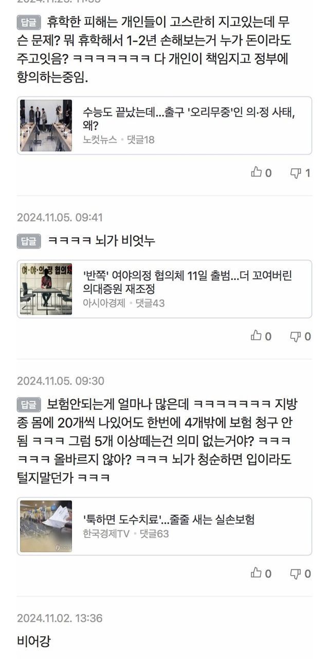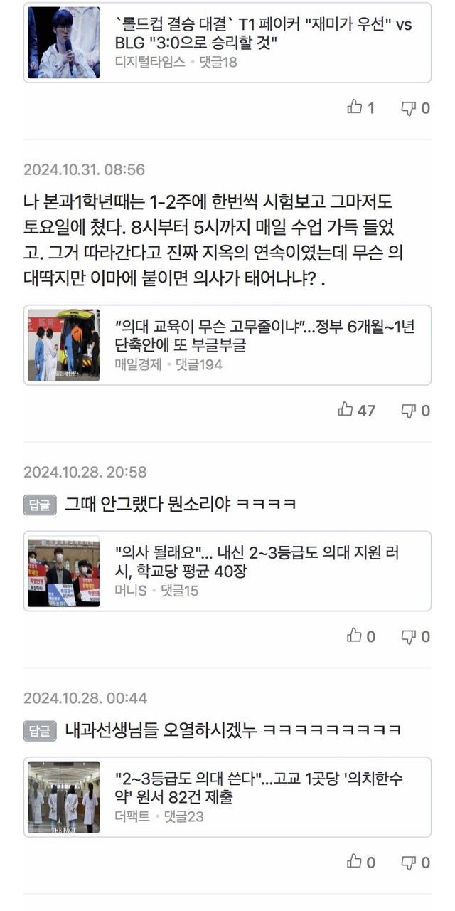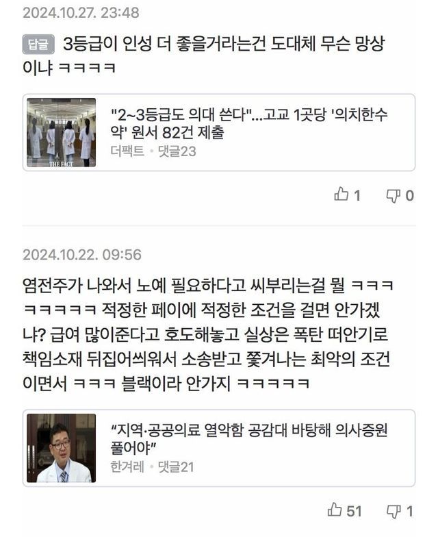 베댓에 갑자기 의대 증원으로 물타기 하는 댓글이 보여서 댓글 목록을 봤더니 ㅋㅋㅋㅋㅋㅋㅋㅋ