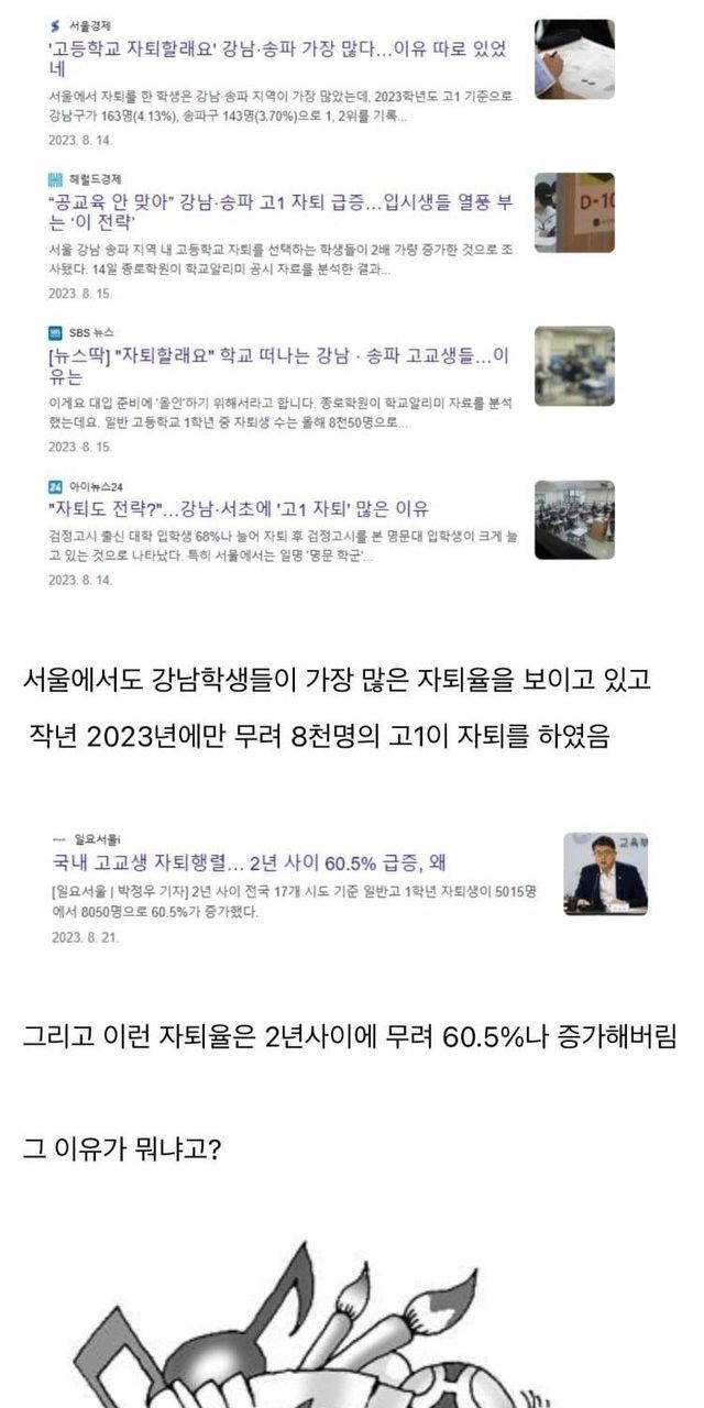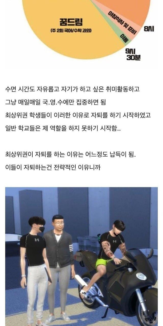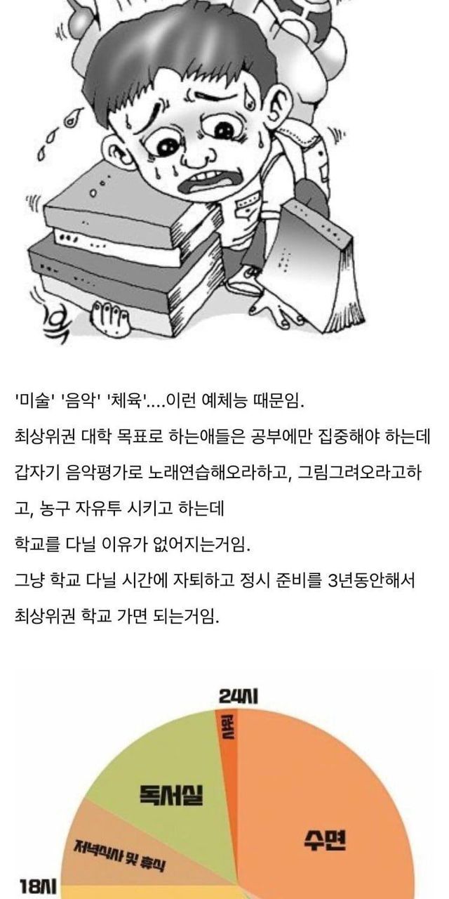 공부 잘하는 학생들은 학교에서 배우는 예체능이 시간 낭비라고 생각해서 자퇴하고 3년 동안 공부해서 정시로 대학 가고,