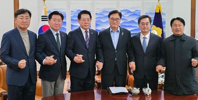(서울=연합뉴스) 민주당 소속 5개 광역단체장들이 4일 오전 우원식 국회의원과 면담하며 윤석열 대통령의 비상계엄 선포와 해제에 따른 대응책을 논의하고 있다. 사진 왼쪽부터 김관영 전북지사, 오영훈 제주지사, 김영록 전남지사, 우원식 국회의장, 김동연 경기지사, 강기정 광주시장.