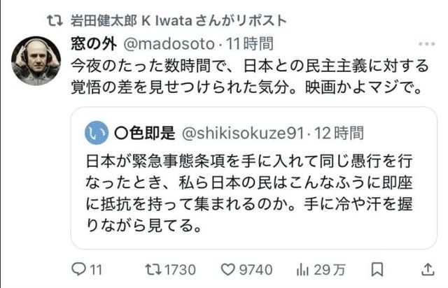 리트윗) 오늘 밤 불과 몇시간 사이에 한국의 민주주의에 대한 각오의 차이가