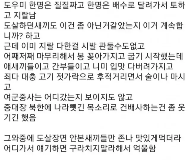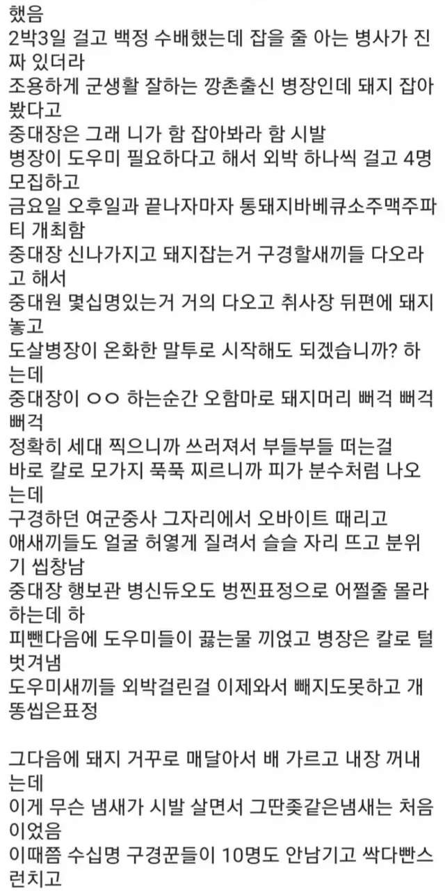 (나중에 알았지만 어렸을 때 시골에서 돼지 잡는걸 본적이 있는 사병은 서너명있었습니다. 하지만 돼지 죽이라고 시킬까봐 가만 있었데요)