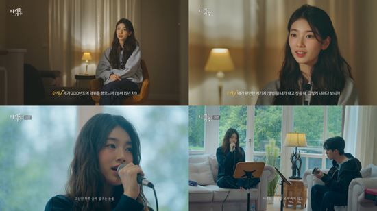 이날 공개된 영상에서 수지는 “제가 2010년도에 데뷔했다. 어느 순간부터 사람들한테 막 알린다는 느낌보다 내가 편안한 시기에 내고 싶을 때 내려다보니까 앨범을 내는 게 조금씩 더뎌지는 것 같다”라며 아티스트로서 자신의 음악적 이야기를 꺼냈다.