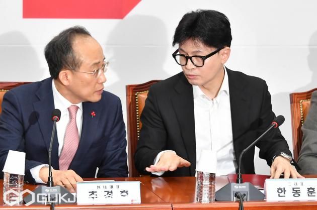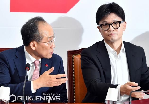 (서울=국제뉴스) 한동훈 국민의힘 대표와추경호 원내대표가 6일 오전 서울 여의도 국회에서 열린 긴급 최고위원회의에서 대화 하고 있다./사진=이용우기자