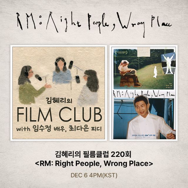 또한 씨네21 김혜리 편집위원, 배우 임수정, SBS 최다은 PD가 진행하는 팟캐스트 ‘김혜리의 필름클럽’을 통해 영화 ‘알엠: 라이트 피플, 롱 플레이스’에 대해 다룬다. 특히 최초 공개되는 RM 음성 인터뷰를 비롯한 영화에 대한 깊이 있는 이야기들이 예고돼 더욱 기대감을 높이며, 해당 에피소드는 6일(금) 바로 오늘 오후 4시 공개된다.