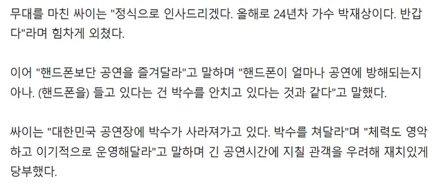 싸이도 최근 열린 인천흠뻑쇼에서 "핸드폰보다 박수를 쳐달라" 말할 정도