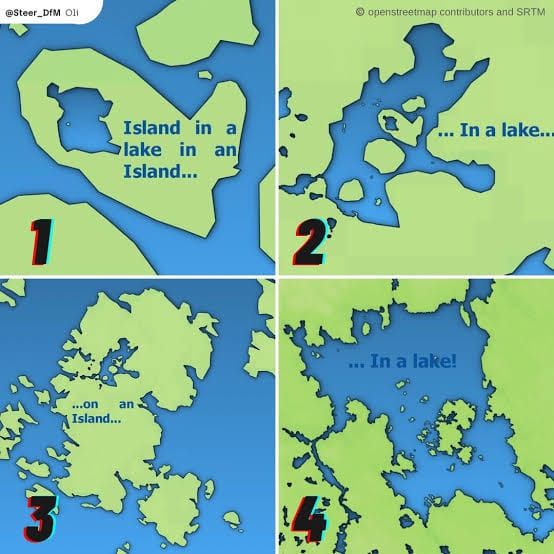 섬이 있는 호수가 섬에 있는데 그게 호수에 있는데 그 호수가 섬에 있고 그 섬 밖에 또 호수가 있음.