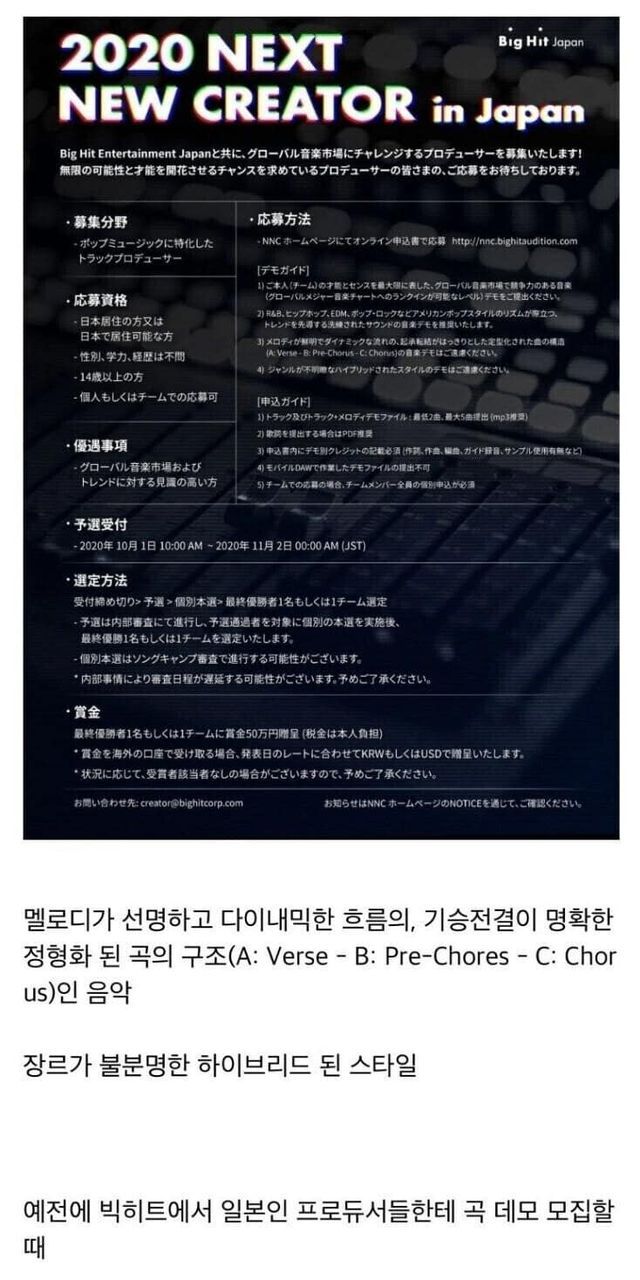 참신한 음악 하는 크리에이터 찾는 응모 안내이며 작곡 리소스 라이브러리에 들어갈 것을 찾는게 목적이라 JPOP 비하는 아니다