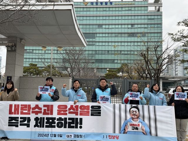 이어 진보당 대전시당도 오후 2시 대전경찰청 앞에서 기자회견을 열고 "내란수괴 윤석열을 즉각 체포하고 구속 수사하라"고 촉구했다.