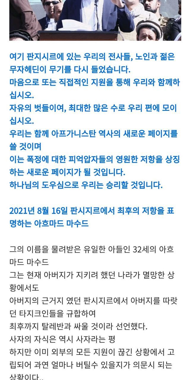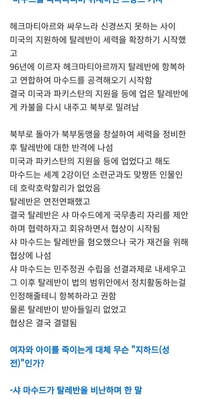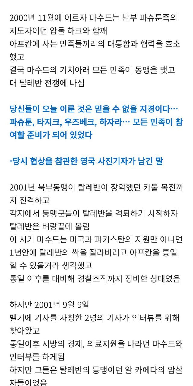 2. 실제로 마수드의 저항군은 적군을 상대로 연전연승을 벌이며 승리 직전까지 갔으나 탈레반의 등장으로 상황 역전됌