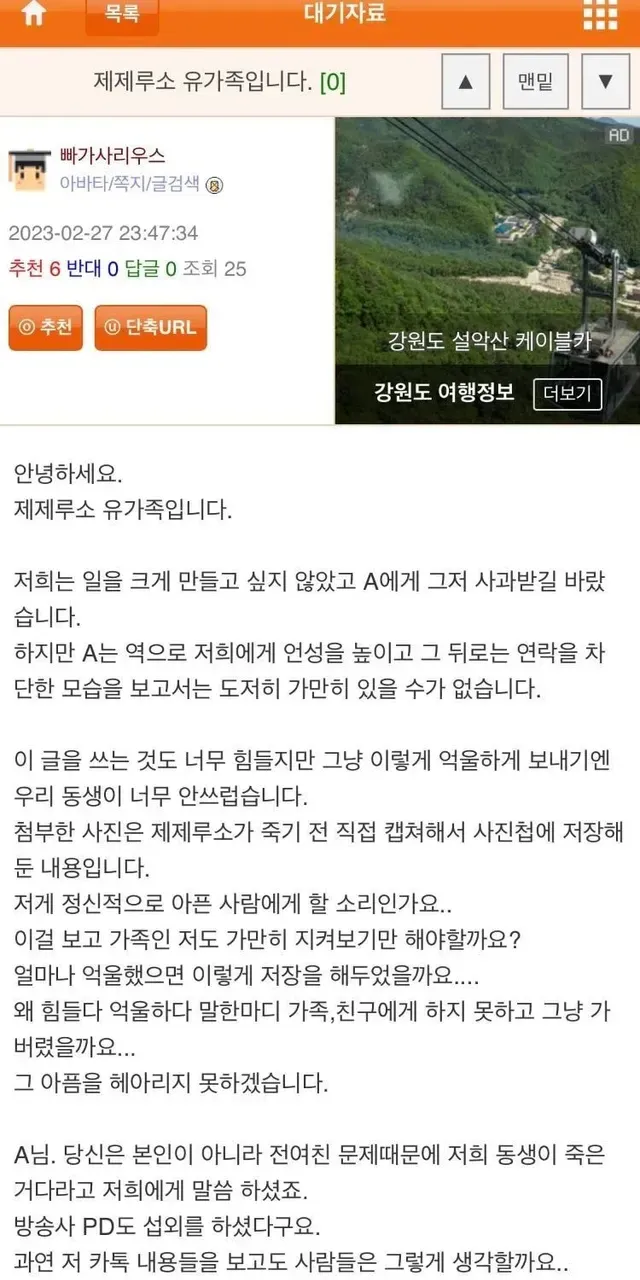 4. 이 댓글들을 다 보고 있던 해당 유저는 혼자서 힘들어하다가 본 계정 탈퇴하고 새로운 계정 만들어서 글 3개 남기고 하늘나라로 가시는 결정을 하심.