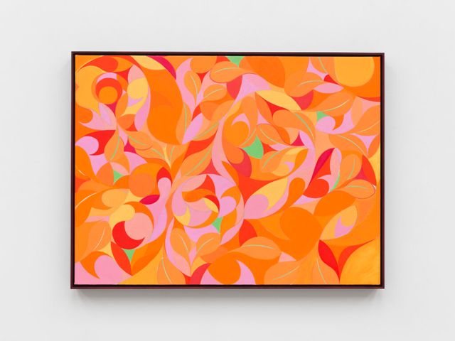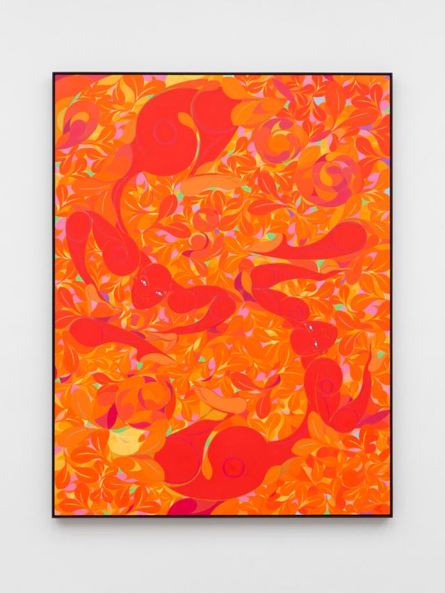 작가의 이러한 특징은 이번 전시에서도 고스란히 드러납니다. 무성한 잎사귀로 뒤덮인 추상적 배경에서 탄력적이고 구불구불한 신체의 실루엣이 반복적으로 교차하며 형태와 색의 융합을 이루죠. 이를 통해 관객은 무아경에 빠지는 경험을 하게 됩니다.