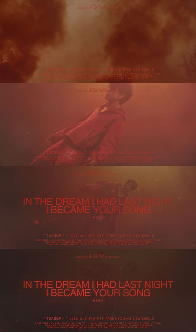 12일 박효신은 공식 SNS를 통해 오는 16일 오후 6시 각종 음원사이트를 통해 공개되는 새 싱글 ‘HERO(히어로)’의 뮤직비디오 티저 영상 1편을 게재했다.