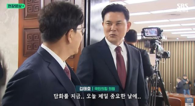 권 의원과 함께 원내대표 후보에 올랐던 김태호 국민의힘 의원 역시 “담화를 오늘 제일 중요한 날에 (하느냐)”라고 말했고, 이에 권 의원은 “그러니까 왜 원내대표 선거 앞두고”라고 공감했다.