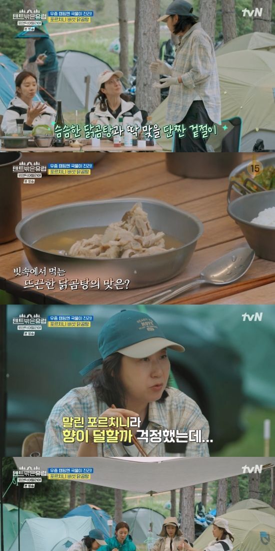 멤버들은 비빔밥으로 허기를 달래고 포르치니 버섯 닭곰탕과 겉절이를 완성해 저녁 식사를 했다. 식사가 시작될 때쯤 비가 내리기 시작했고, 멤버들은 빗속에서 뜨끈한 국물을 먹으며 흡족해했다.