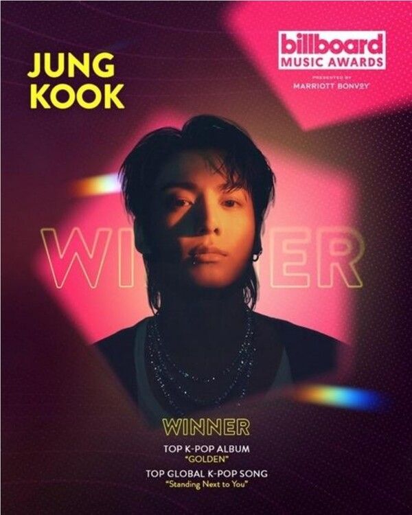 이는 지난해 'Seven (feat. Latto)'으로 '톱 글로벌 K-팝 송'을 수상한 데 이어 2년 연속 수상하는 쾌거다. 정국의 솔로 앨범 'GOLDEN'은 미국 빌보드 메인 앨범차트 '빌보드 200'에 2위로 진입하며 24주 연속 차트인이라는 기록을 세웠고, 타이틀곡 'Standing Next to You'는 '핫 100' 5위에 오르며 글로벌 팝스타로서의 입지를 굳혔다.