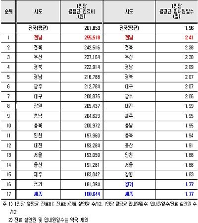 시도별 1인당 월평균 입내원일수도 전남이 2.41일로 가장 높고, 경기·세종이 1.77일로 가장 낮았다.