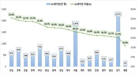 2023년 말 시도별 65세 이상 의료보장 적용인구 비율은 전남 25.6%, 경북 24.2%, 강원 23.7%, 전북 23.7% 부산 22.4% 순이다.