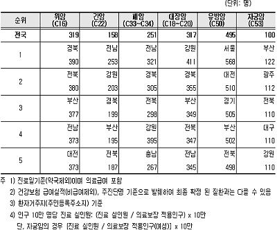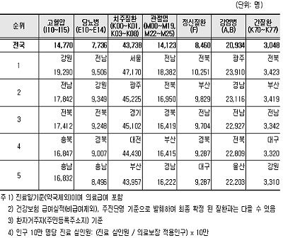 질환별로는 고혈압은 강원 1만 9,290명, 당뇨병은 전남 9,506명, 치주질환은 서울 4만 7,170명, 관절염은 전남 1만 8,382명, 정신질환은 전북 1만 251명, 감염병은 광주 2만 3,910명, 간질환은 전북 3,423명으로 가장 많았다.