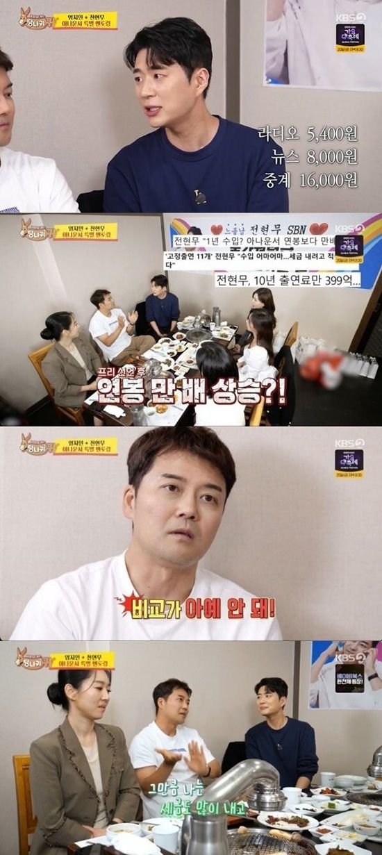 이에 전현무는 "사실 만 배인지 몇 배인지는 모르겠다. 계산을 안 해 봤는데, 비교가 아예 안 된다"고 솔직히 털어놓으며 "그렇지만 그만큼 세금도 많이 낸다"고 밝혔다.