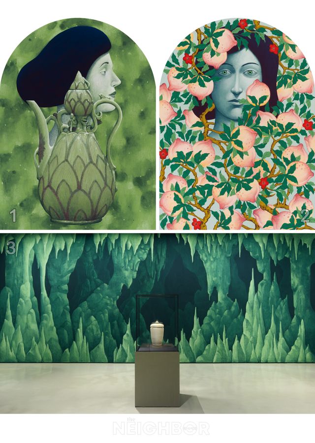 1 니콜라스 파티, ‘청자 주자가 있는 초상’, 2024, 리넨에 소프트 파스텔, 150.1×110cm, 작가 및 하우저앤워스 제공. ©니콜라스 파티, 사진: Adam Reich 2 니콜라스 파티, ‘복숭아가 있는 초상’, 2024, 리넨에 소프트 파스텔, 150×109.9cm, 작가 및 하우저앤워스 제공. ©니콜라스 파티, 사진: Adam Reich 3 (앞) ‘백자 태호’, 조선백자, 41×25.3 cm, 국립중앙박물관, 이건희 회장 기증. 전경 사진: 김상태 (뒤) 니콜라스 파티, ‘동굴’, 2024, 벽에 소프트 파스텔, 380×908 cm, 작가 제공. ©니콜라스 파티