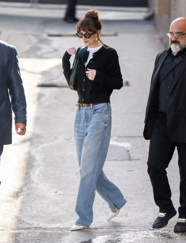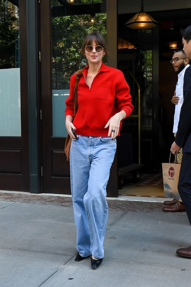 예쁘게 낡은 일자 핏의 빈티지 데님을 베이직한 카디건, 니트와 함께 매치한 다코타 존슨. 귀여운 키튼 힐까지 더해주니 이보다 쿨할 수 없습니다.