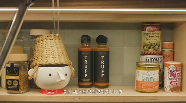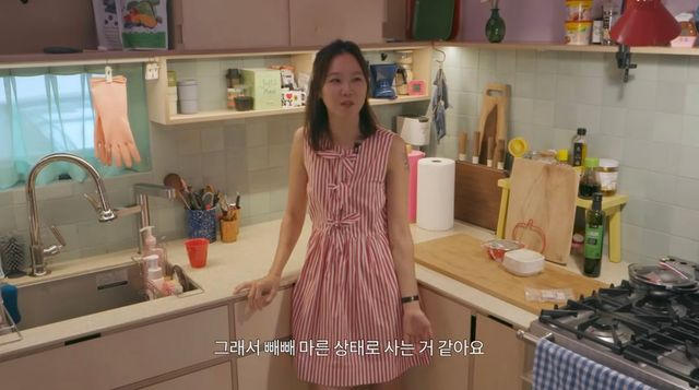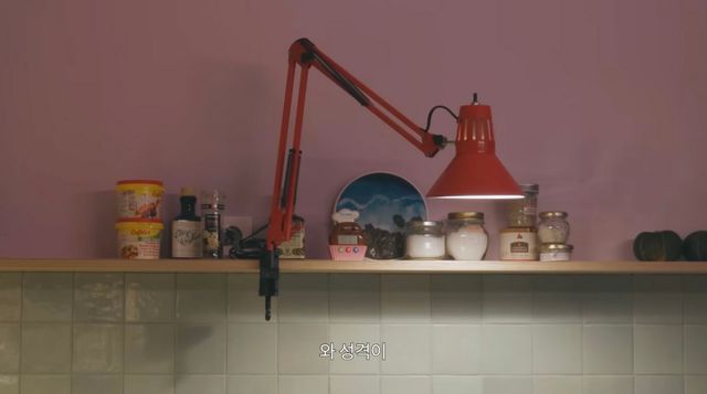 부엌은 공효진이 자주 사용하는 공간임을 한눈에 알 수 있습니다. 깔끔하게 정돈되기보다는 일상적인 도구들이 복작복작하게 자리 잡고 있죠. 행주나 고무장갑 같은 소소한 생활감이 묻어나면서도, 곳곳에 배치된 조명이 위트 있는 인테리어 감각을 보여줘요.