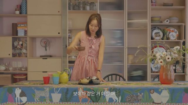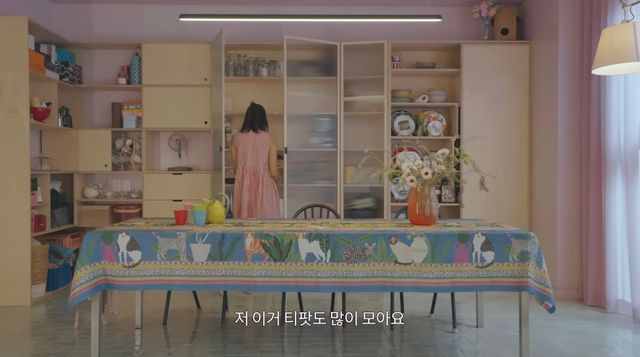 다양한 패턴의 전통 티 세트와 집들이를 위해 직접 구매한 식탁보 등, 식탁 디테일에서도 그의 통통 튀는 취향을 엿볼 수 있습니다.