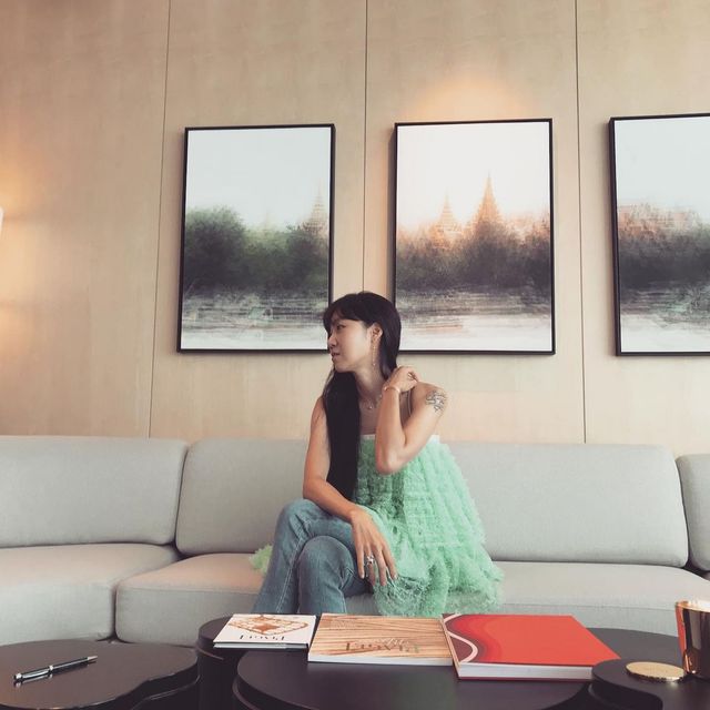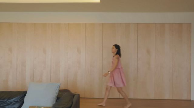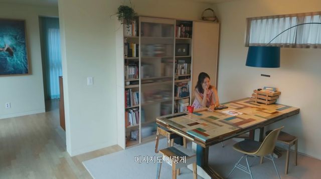 다이닝 공간은 단연 그녀의 인테리어 감각을 엿볼 수 있는 곳입니다. 레몬을 연상시키는 페일 셀러리 색 수납장이 산뜻한 분위기를 자아내요. 특히 왼쪽엔 레몬색 여닫이문, 오른쪽엔 반투명 여닫이문을 달아 보는 재미를 더했습니다. 벽은 연한 복숭아를 닮은 비치 플럼 색으로 칠해 전체적으로 따스한 무드를 완성했죠.