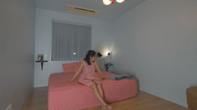 침실은 화이트와 레드 스트라이프 침구로 깔끔하면서도 사랑스럽게 연출했습니다. 원하는 패턴을 찾기 위해 동대문까지 간 건 물론이고, 원래는 옷에 쓰이는 테리 원단을 선택해 침구를 완성했다고. 디테일을 중시하는 모습이 인상적이네요.