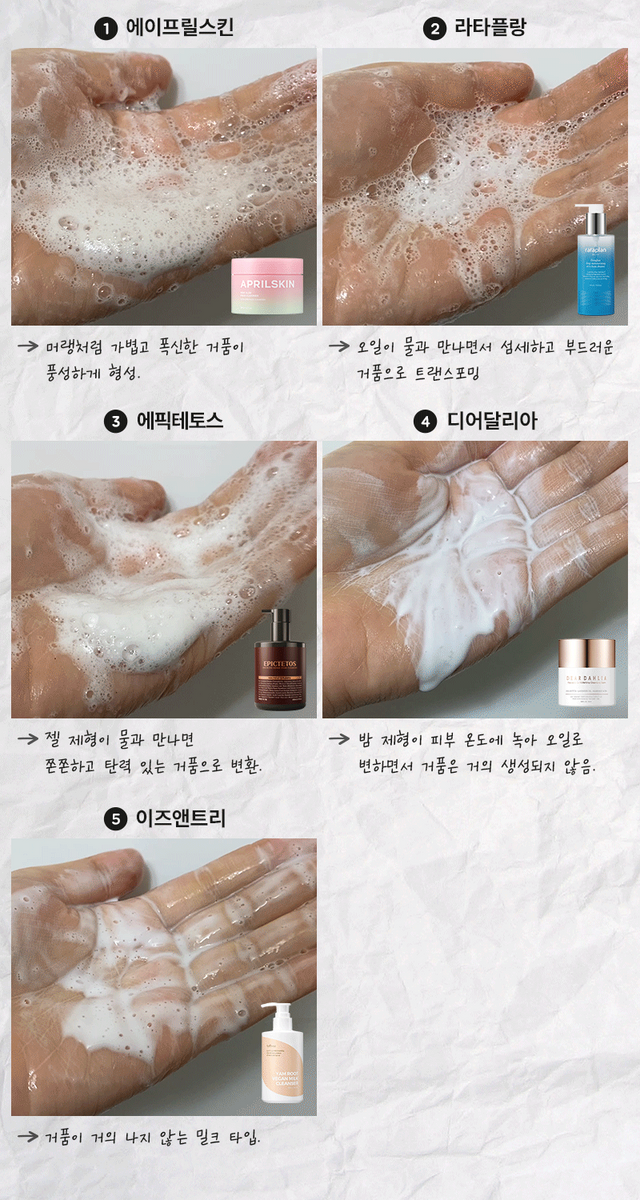 각 제품의 거품이 어떻게 피부를 감싸며 세정을 도와주는지 확인해 보자.