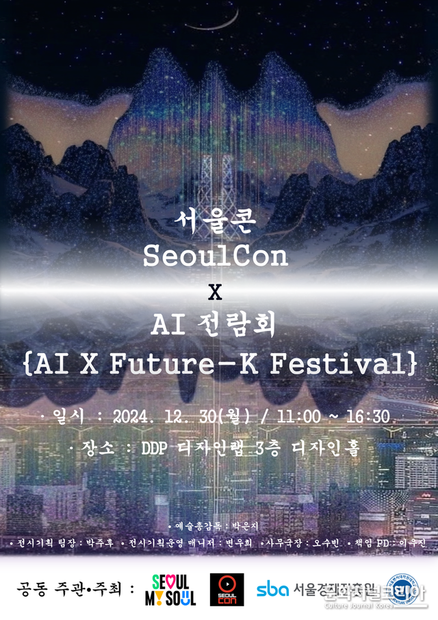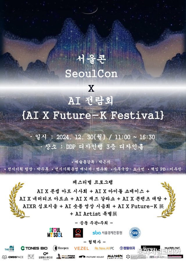 이번 행사는 12월 30일(월) 오전 11시부터 오후 4시 30분, 동대문 DDP 디자인랩 3층 디자인홀에서 진행되며, ▲ AI X 컨셉 아트 시사회(11:00 ~ 11:20) ▲ AI X 아이돌 쇼케이스(11:20 ~ 11:40) ▲ AI X 네러티브 아트쇼(11:40~12:00) ▲ AI X 재즈 갈라쇼(12:00 ~ 12:20) ▲ AI X 콘텐츠 대담(12:20 ~ 12:40) ▲ AIXR 심포지움(12:40 ~ 13:45) ▲ AI 숏폼 영상 시음회(13:50 ~ 16:30) ▲ AI X Future-K 展 ▲ AI Artist 특별展 등 총 9개의 세션으로 구성, AI와의 융합을 필두로 문화예술·콘텐츠 전방위 영역에서 가장 혁신적이고 트렌디한 창작물을 선보인다.