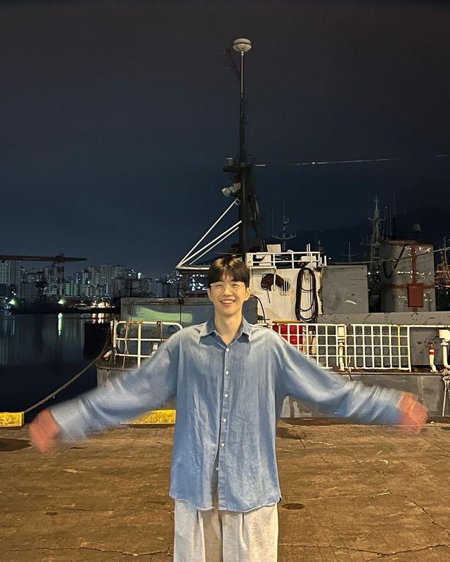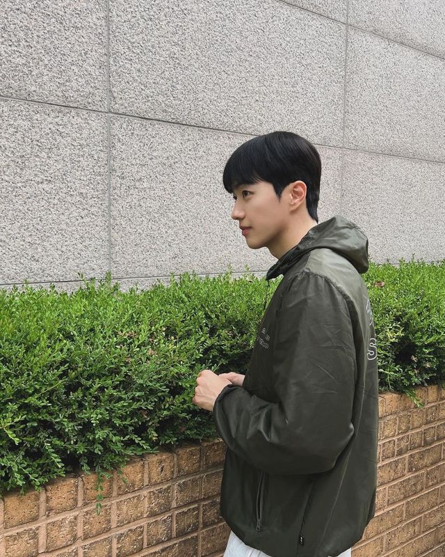 캐주얼한 바람막이입니다. 가벼운 산행에는 화이트 포인트가 더해진 바람막이를 끝까지 올려 입으며 편안한 무드를 완성했죠. 카키 색 바람막이를 입고 화단 앞에 서 있는 모습에선 자연스러운 멋이 가득 묻어나지 않나요? 마치 집 앞 데이트를 나온 듯, 팬들의 상상을 마구 불러일으키는 모습입니다.