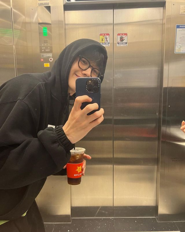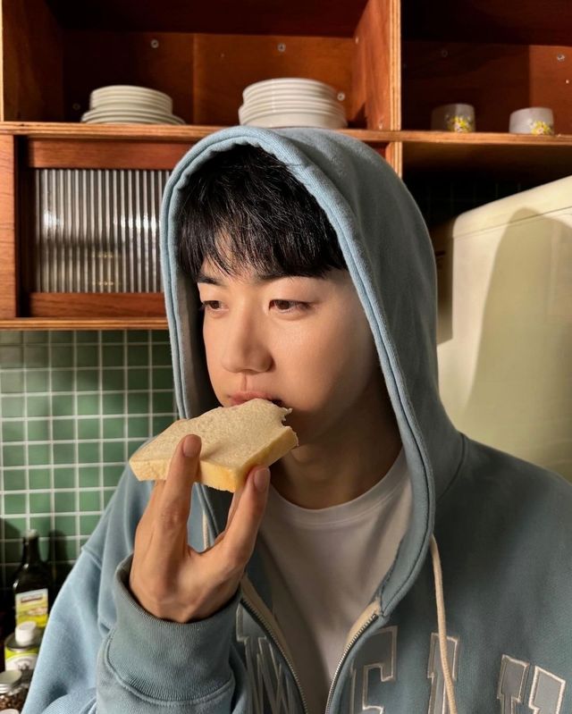후드입니다. 부담 없이 입을 수 있어 손이 잘 가는 동시에, 어떤 하의와도 찰떡같이 어울리기 때문인데요. 특히 강훈이 후드를 활용하는 방식은 ‘귀여움’입니다. 엘리베이터 거울샷에서는 검은 후드에 리본을 자연스럽게 묶어 애교스러운 모습을 부각했어요. 하늘색 후드 집업을 반쯤 올린 채 빵을 문 사진은 이미 수많은 팬들의 배경화면일 게 틀림없군요.