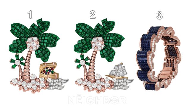 1, 2 변형 가능한 팔미에 미스터리유(Palmier Myste´rieux) 클립. 로즈 골드, 옐로 골드, 화이트 골드, 트래디셔널 미스터리 세팅 에메랄드, 에메랄드, 루비, 사파이어, 다이아몬드. 3 코키유 미스터리유즈(Coquilles Myste´rieuses) 브레이슬릿. 화이트 골드, 옐로 골드, 로즈 골드, 트래디셔널 미스터리 세팅 버프톱 사파이어, 사파이어, 다이아몬드.