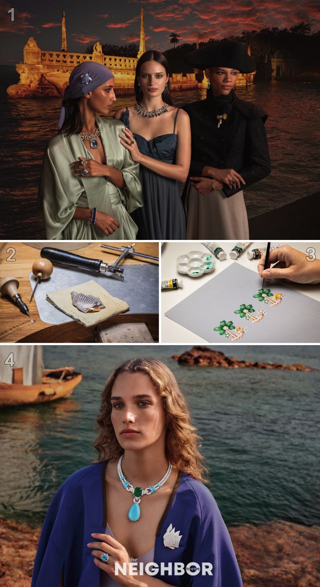 1, 4 로버트 루이스 스티븐슨의 소설 <보물섬>에서 영감을 받은 반클리프 아펠의 테마틱 하이 주얼리 컬렉션 ‘트레저 아일랜드’. 2 히스파뇰라 클립 완성품을 체크하는 모습. 3 팔미에 미스터리유 클립 스케치 드로잉.