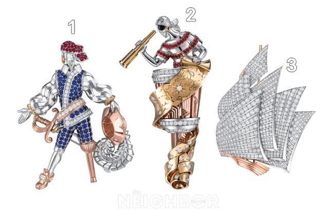 1, 2 피라트 존(Pirate John) 클립과 피라트 짐(Pirate Jim) 클립. 화이트 골드, 옐로 골드, 로즈 골드, 루비, 사파이어, 블랙 래커, 다이아몬드. 3 히스파뇰라(Hispaniola) 클립. 화이트 골드, 로즈 골드, 다이아몬드.