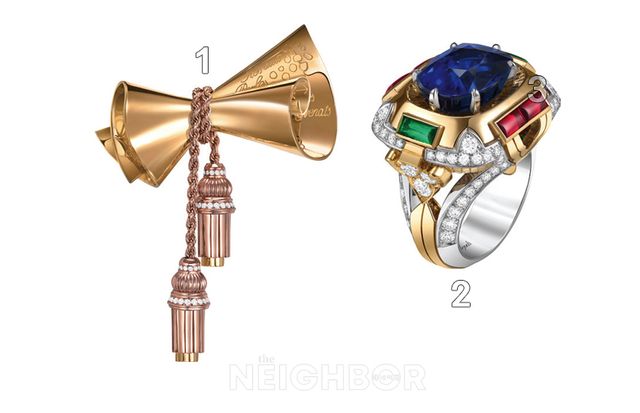 1 카르트 오 트레저(Carte au tre´sor) 클립. 옐로 골드, 로즈 골드, 루비, 다이아몬드. 2 코프르 프레시유(Coffre pre´cieux) 링. 옐로 골드, 화이트 골드, 14.32캐럿의 쿠션 컷 사파이어 1개, 에메랄드, 루비, 다이아몬드.